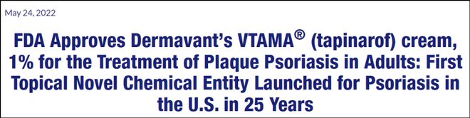 5月24日(ri),美國(guo)FDA批準DermavantSciences公司(si)的VTAMA®(tapinarof)乳膏用(yong)于治療成(cheng)人斑塊狀銀屑病。